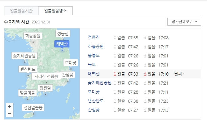 2일 후면 2024년 갑진년 새해가 시작되는데 새롭게 시작하는 만큼 멋진 곳에서 새해 일출을 보며 새로운 시작 힘차게 해 보세요, 오늘은 전국 해돋이, 해맞이 명소 10곳을 추천해 드리겠습니다. 다른 곳에 해돋이 방문 계획이 있으시면 아래 일출 일몰시간 확인해 보세요.